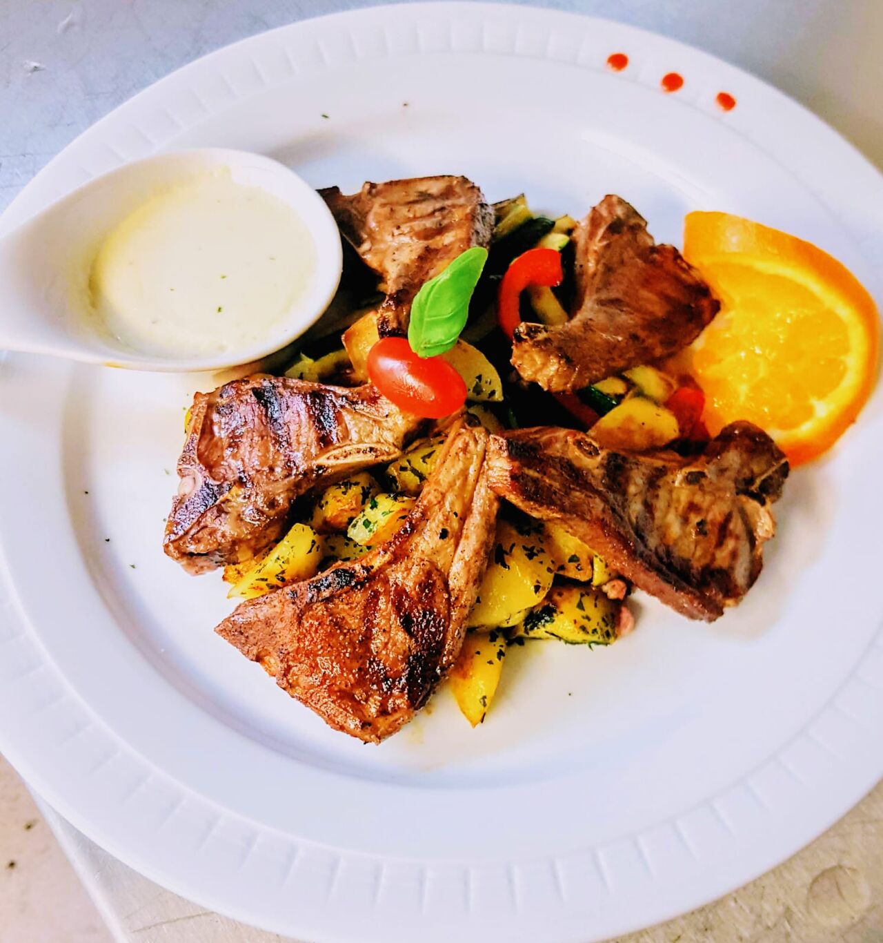 Verweilen Sie in unseren mediteran gestalteten Räumlichkeiten mit 40 Sitzplätzen und lassen Sie sich kulinarisch verwöhnen. Wählen Sie zwischen Vorspreisen, Hauptgerichten und Desserts aus unserer Speisekarte und an Sonn- und Feiertagen zusätzlich aus unserer wechselnden Tageskarte.